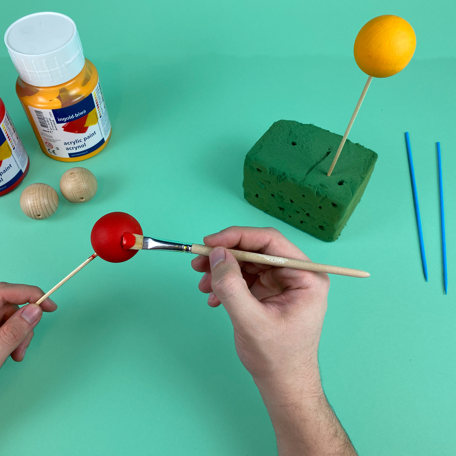 Die Holzkugeln und Schaschlikstäbchen werden vollständig mit Acrylfarbe bemalt und zum Trocknen zur Seite gelegt.