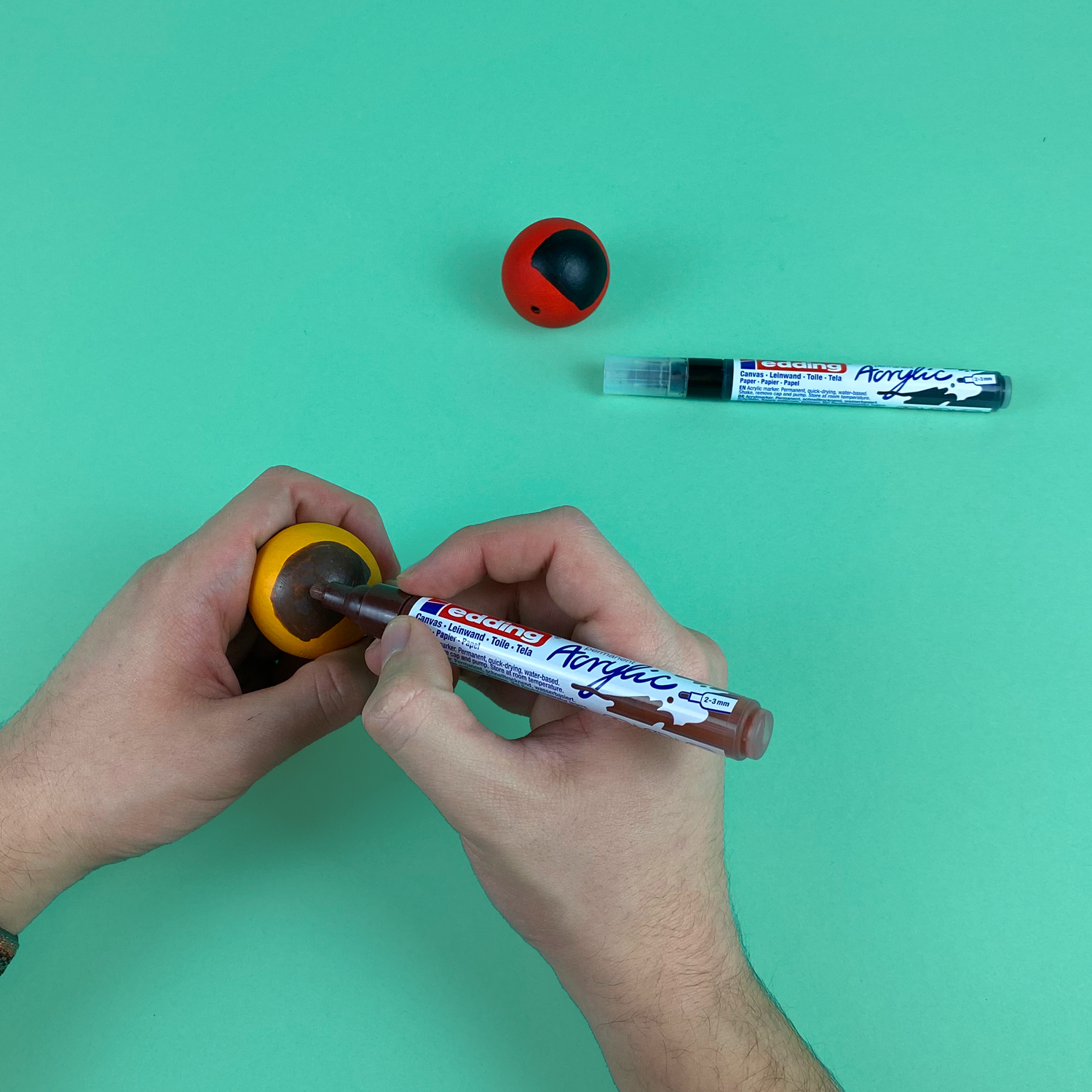 Ist die Farbe trocken, werden mit einem Acrylmarker die Gesichter der Insekten und die Streifen der Biene aufgemalt.