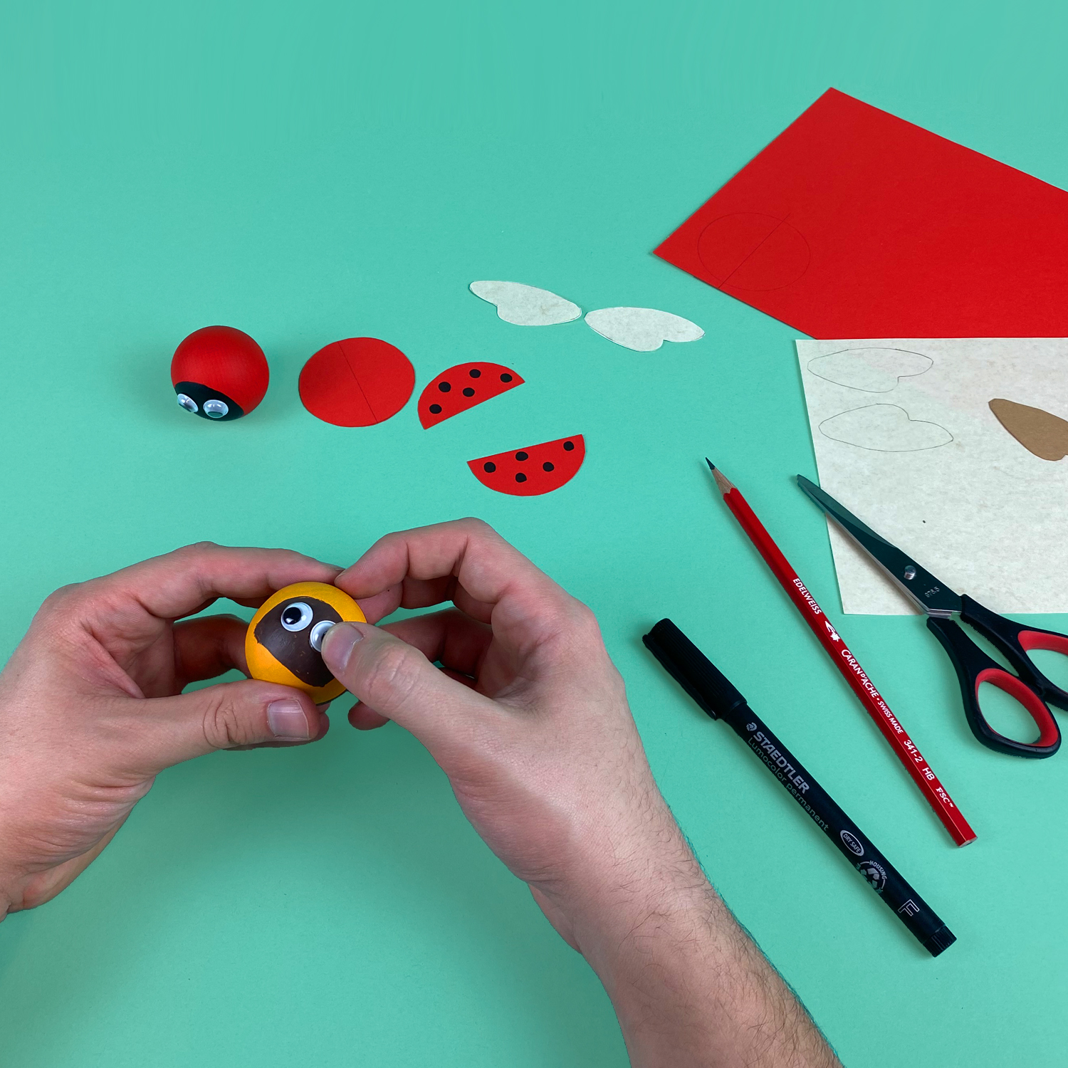 Für die Marienkäferflügel wird ein Kreis mit einem Durchmesser von 5 cm aufgezeichnet und ausgeschnitten. Die charakteristischen Punkte werden aufgemalt. Für die Biene wird eine kleine Flügel-Schablone hergestellt und doppelt ausgeschnitten. Die Wackelaugen werden aufgeklebt.