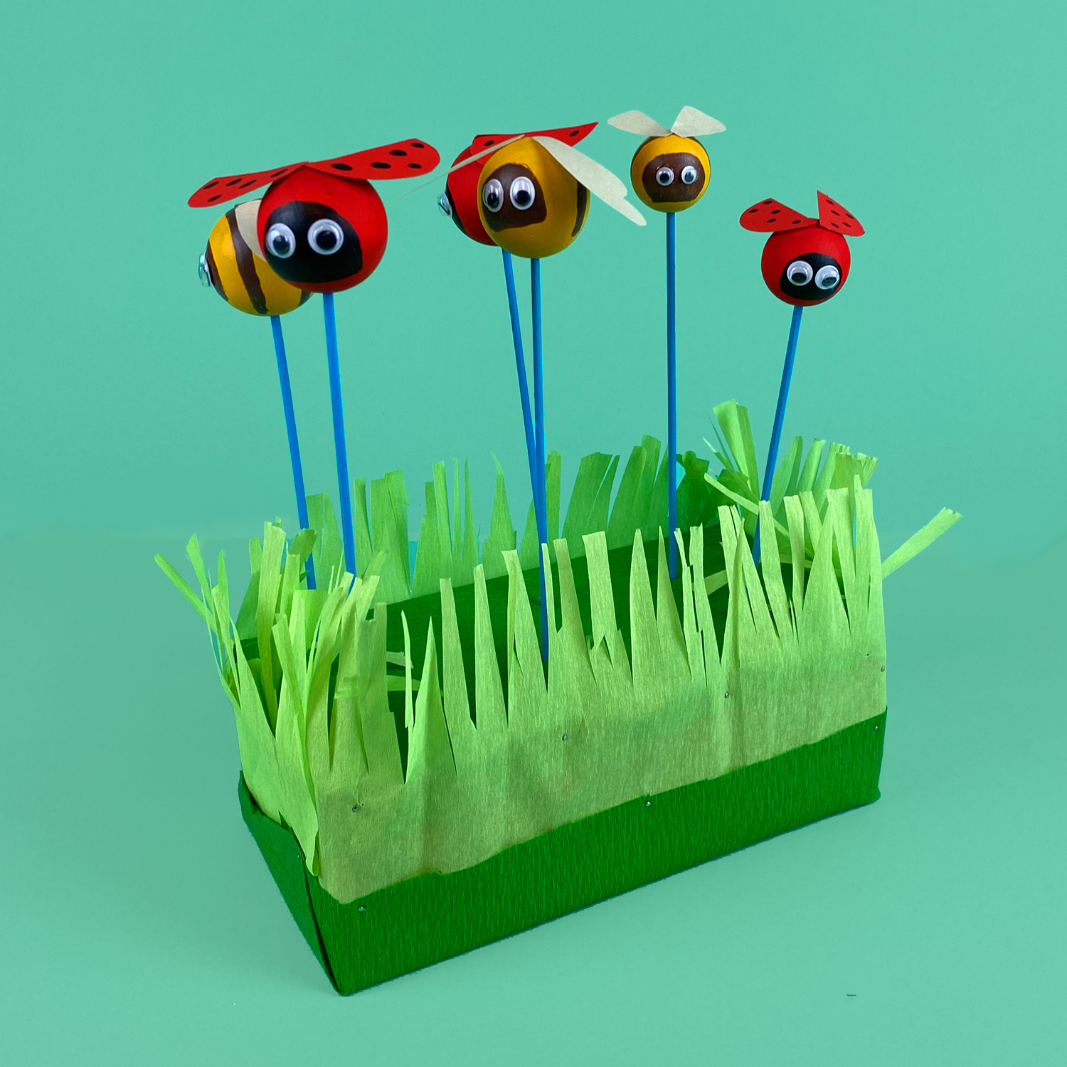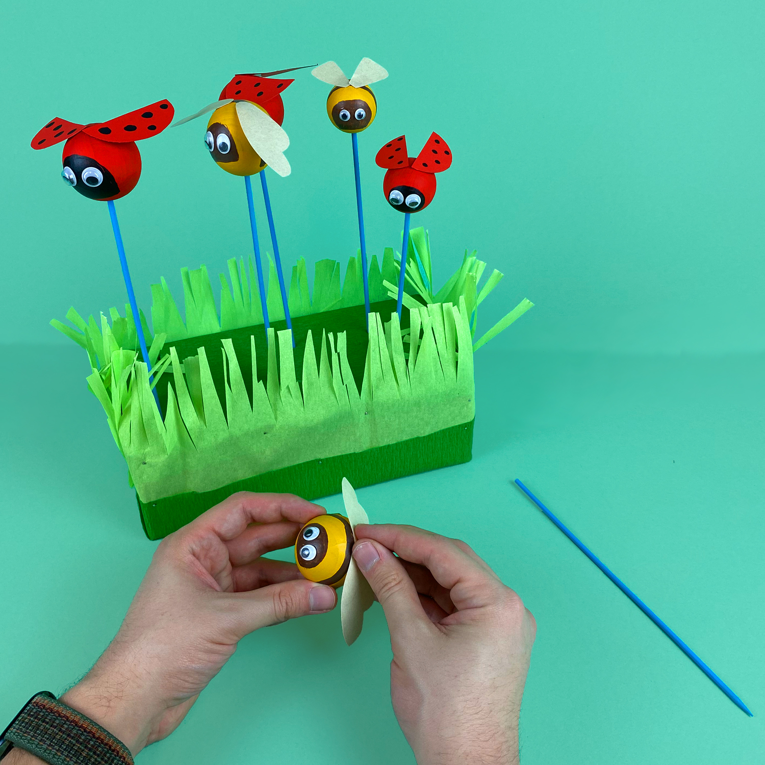 Die Flügel werden mit doppelseitigem Klebeband an der Kugel befestigt. Die fertigen Insekten werden mit dem Schaschlikstab in einen Styroporblock gesteckt, um die Optik einer belebten Frühlingswiese zu erzeugen.
