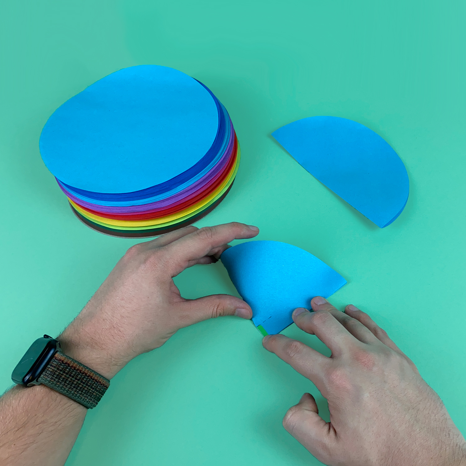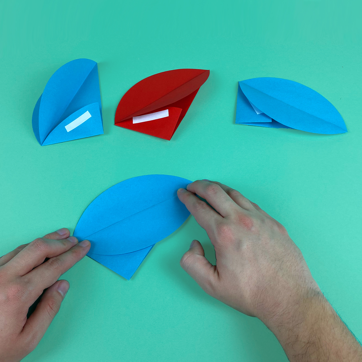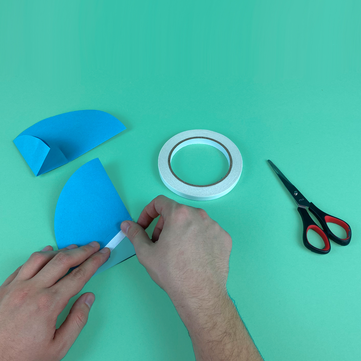Der Kreis wird zur Hälfte geöffnet und der untere Teil in die Mitte gefaltet. Ein doppelseitiges Klebeband (ca. 4 cm) wird angebracht.