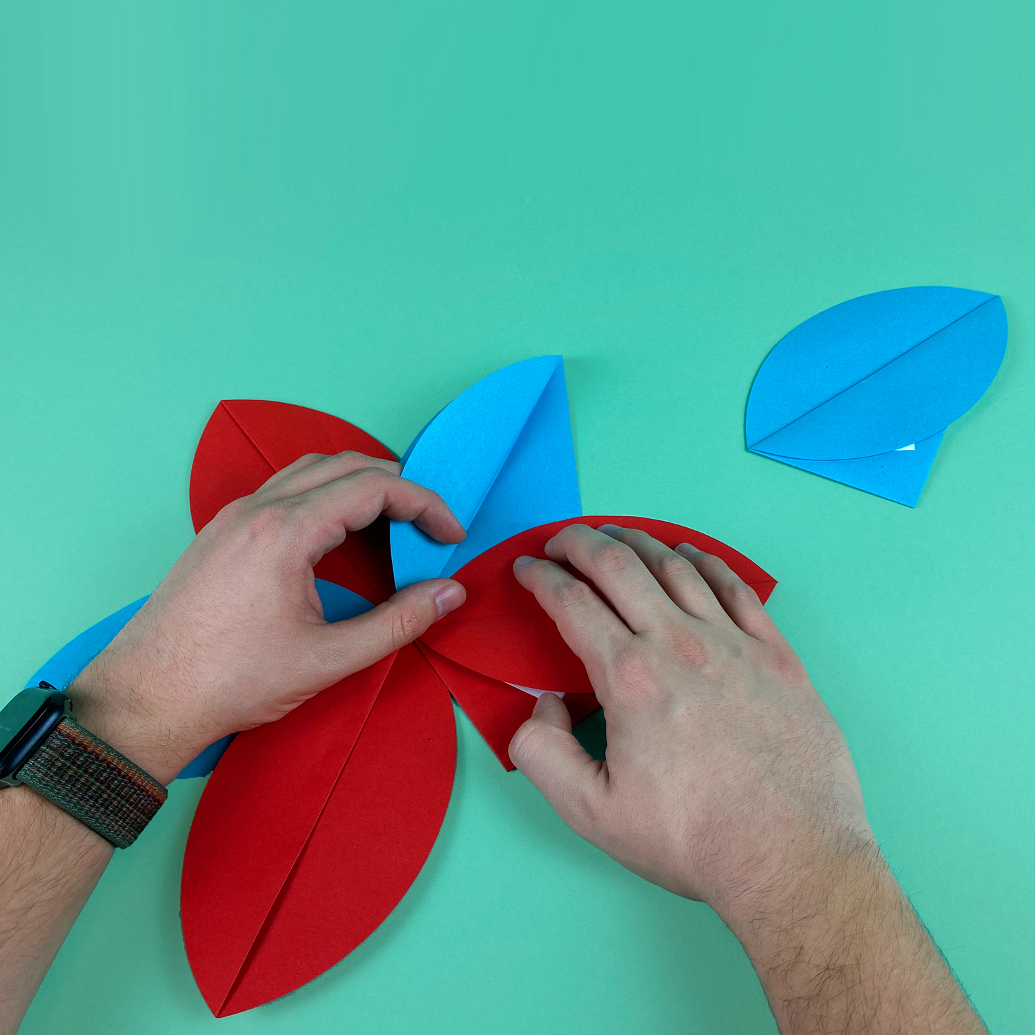 Die Schutzfolie des Klebebands des ersten Blattes wird abgezogen und das zweite Blatt wird daruntergelegt. So werden die 6 Blätter zu einer ausgewogenen Blume zusammengeklebt. Dabei gilt es zu beachten, dass die Blütenblätter nicht zu eng aneinandergeklebt werden.