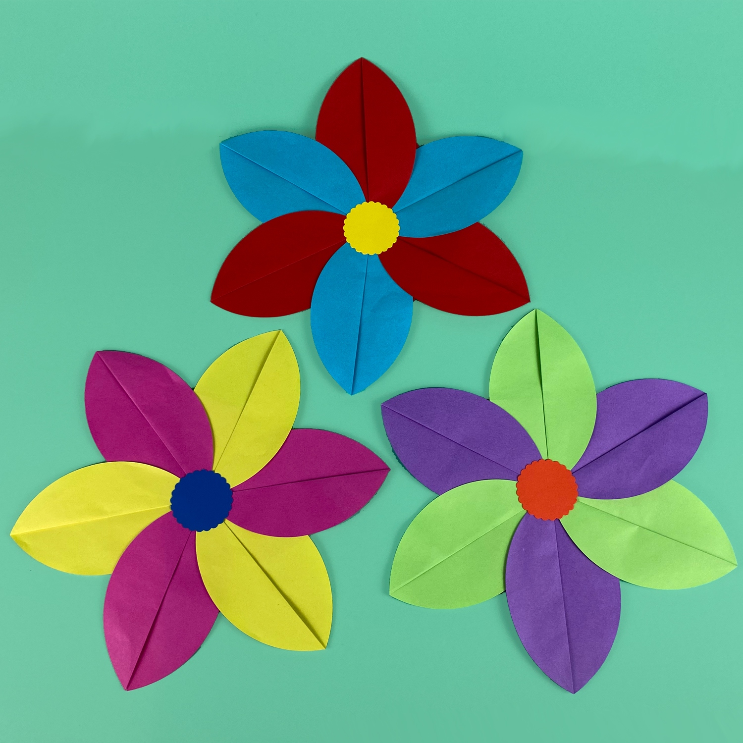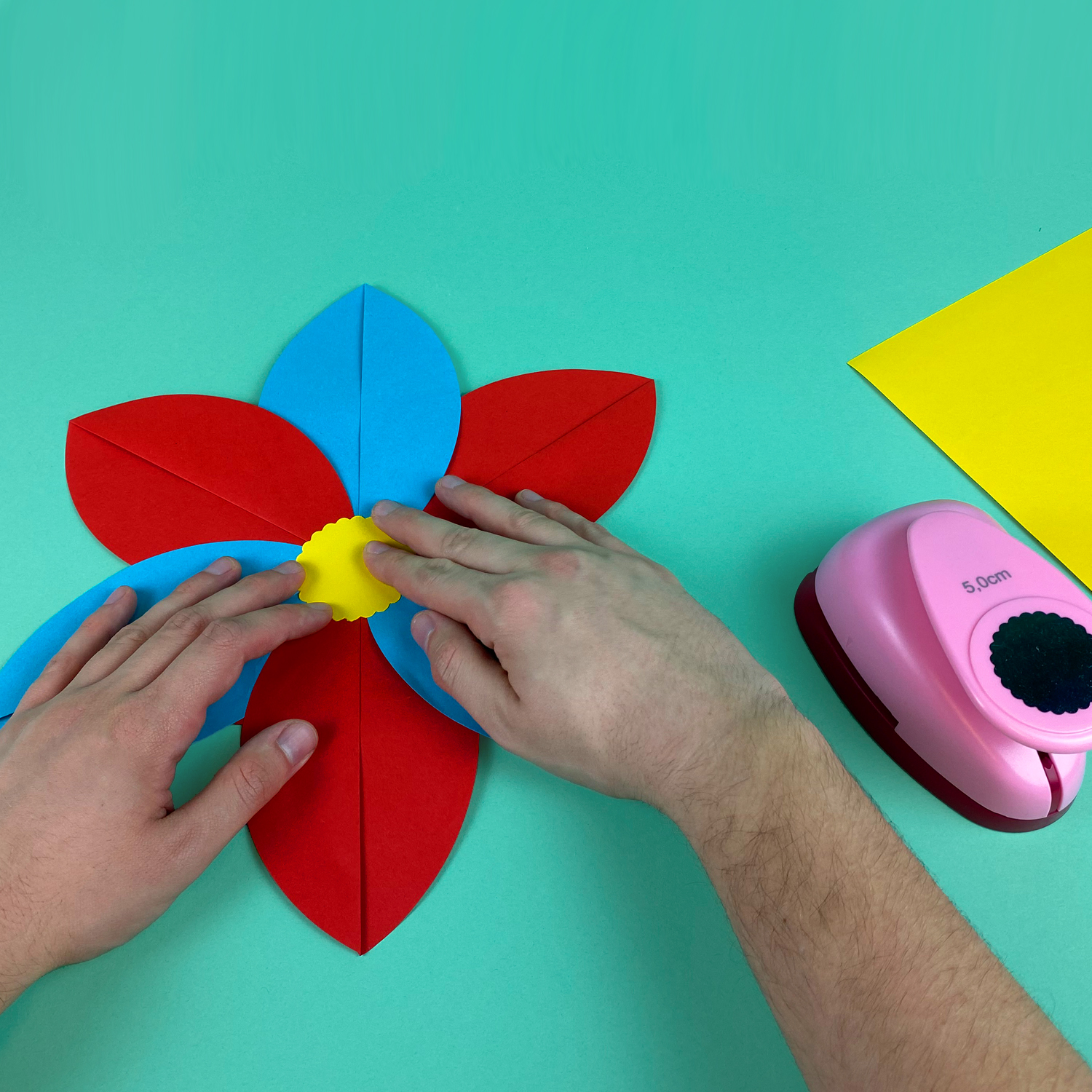 Aus Tonzeichenpapier oder Fotokarton wird ein Kreis ausgestanzt und in die Mitte geklebt. Die fertigen Blumen können an einer freien Wand oder dem Fenster angebracht werden.