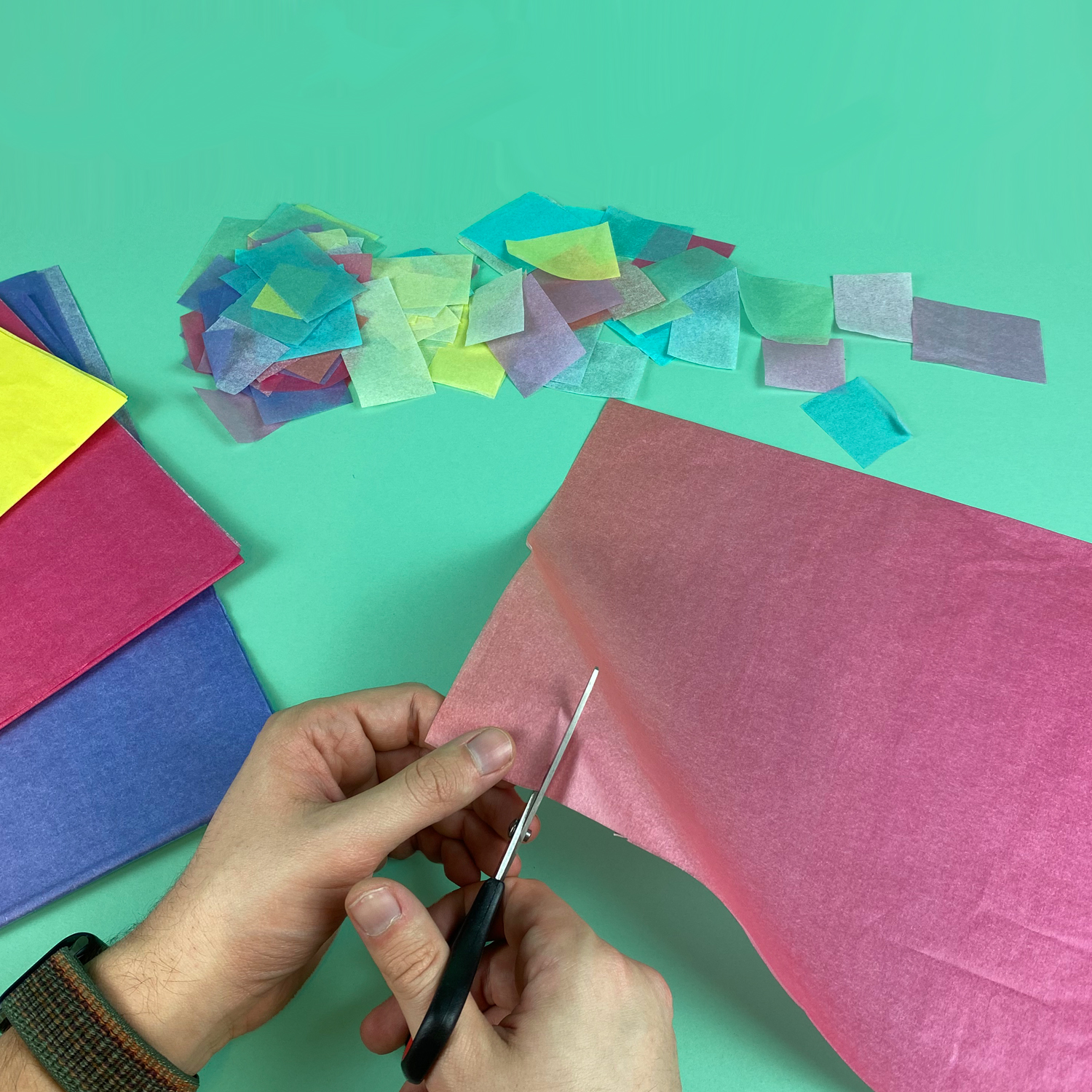 Aus Seidenpapier werden unterschiedlich grosse, rechteckige Stücke ausgeschnitten.