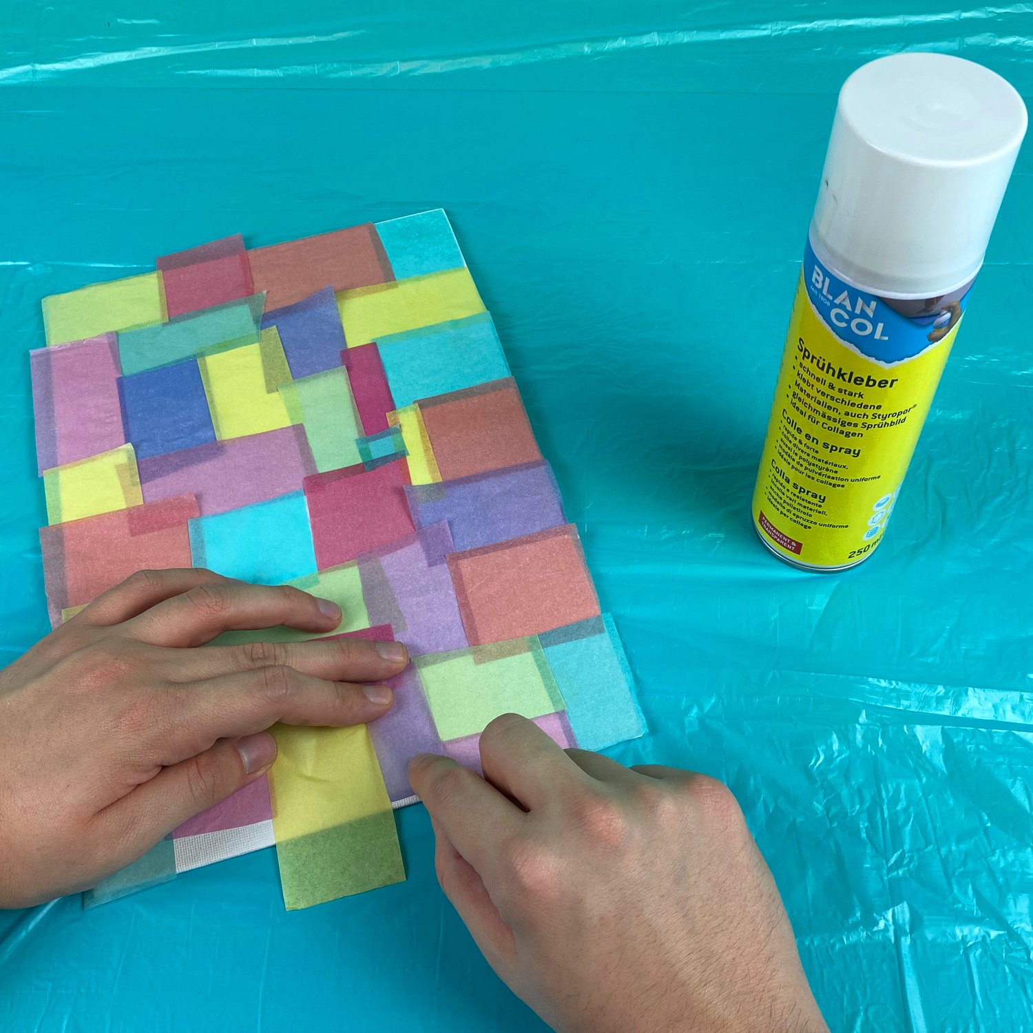 Der Malkarton wird mit Sprühkleber besprüht und die Rechtecke aufgeklebt. Nach dem Trocknen werden die überstehenden Papierstücke am Kartonrand zurückgeschnitten.