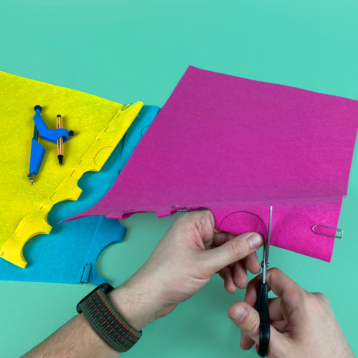 Die Softfilz-Zuschnitte werden auf eine Grösse von ca. 4 cm umgelegt und mit Briefklammern oder Stecknadeln fixiert. Mit einem Zirkel werden Halbkreise in verschiedenen Grössen angezeichnet und ausgeschnitten.