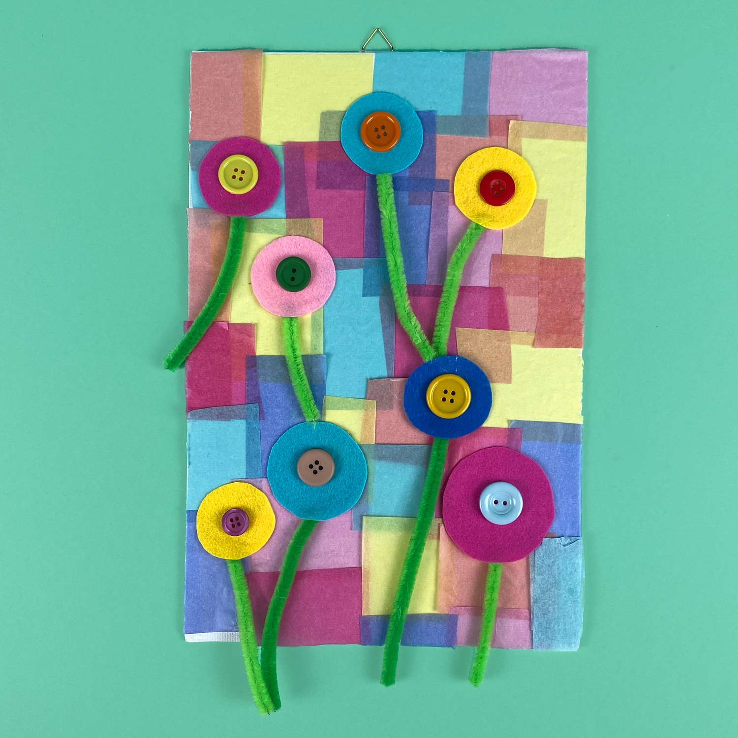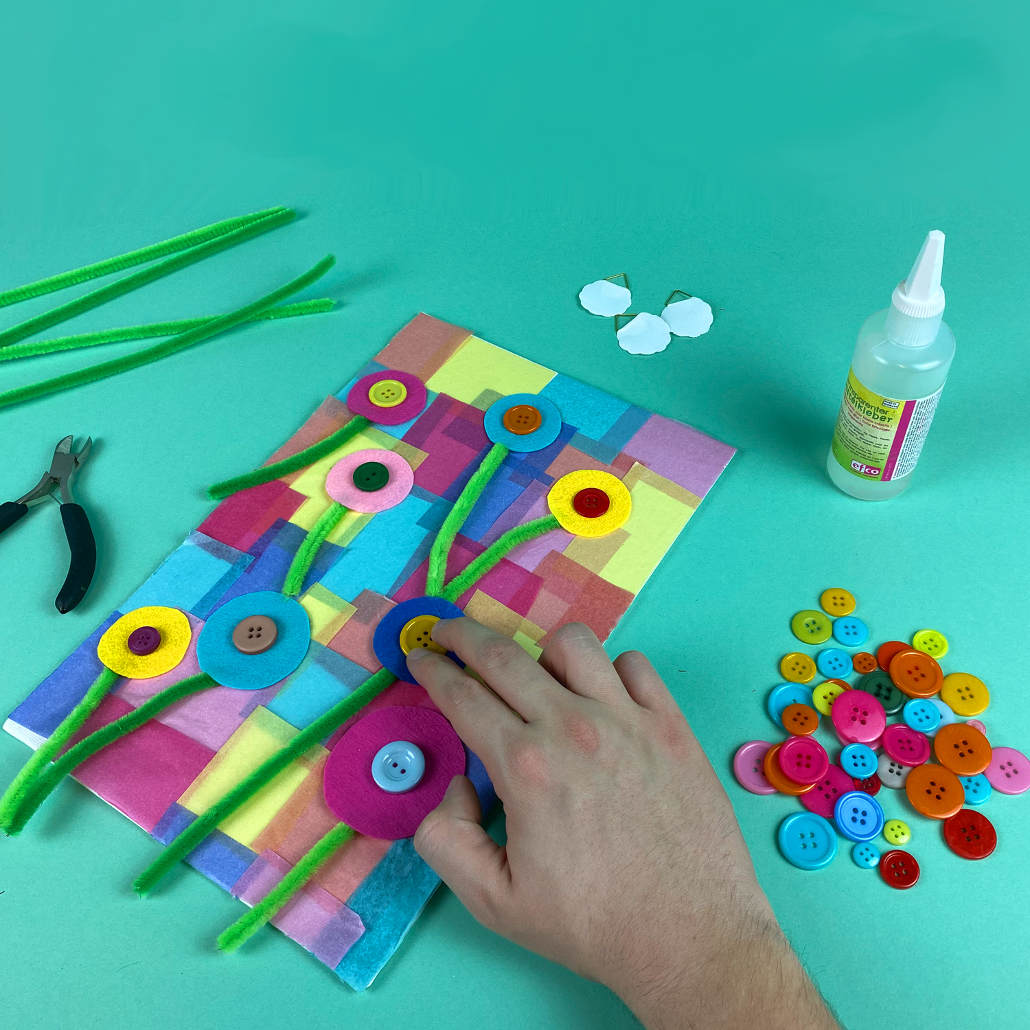 Die Filzkreise werden auf den Malkarton geklebt und farbige Knöpfe in der Mitte befestigt. Grüne Pfeifenputzer werden als Blumenstängel aufgeklebt. Bildaufhänger werden auf der Rückseite angebracht.