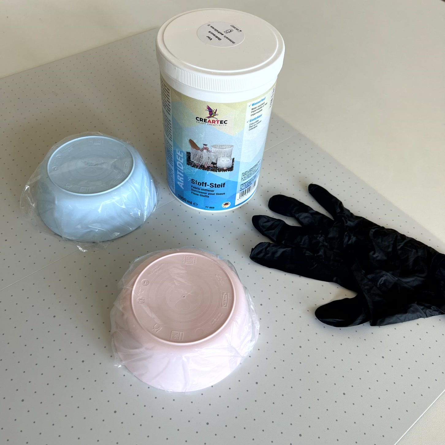 Zu Beginn wird die Arbeitsfläche mit einer Unterlage geschützt und alle benötigten Materialien bereitgelegt. Die Stoff-Steif-Flüssigkeit sollte vor der Verwendung gut aufgerührt werden. Einweghandschuhe schützen die Hände, Klarsichtfolie die Form. Die Gefässe werden vollständig mit Folie umwickelt – so lässt sich das fertige Körbchen später leicht ablösen.