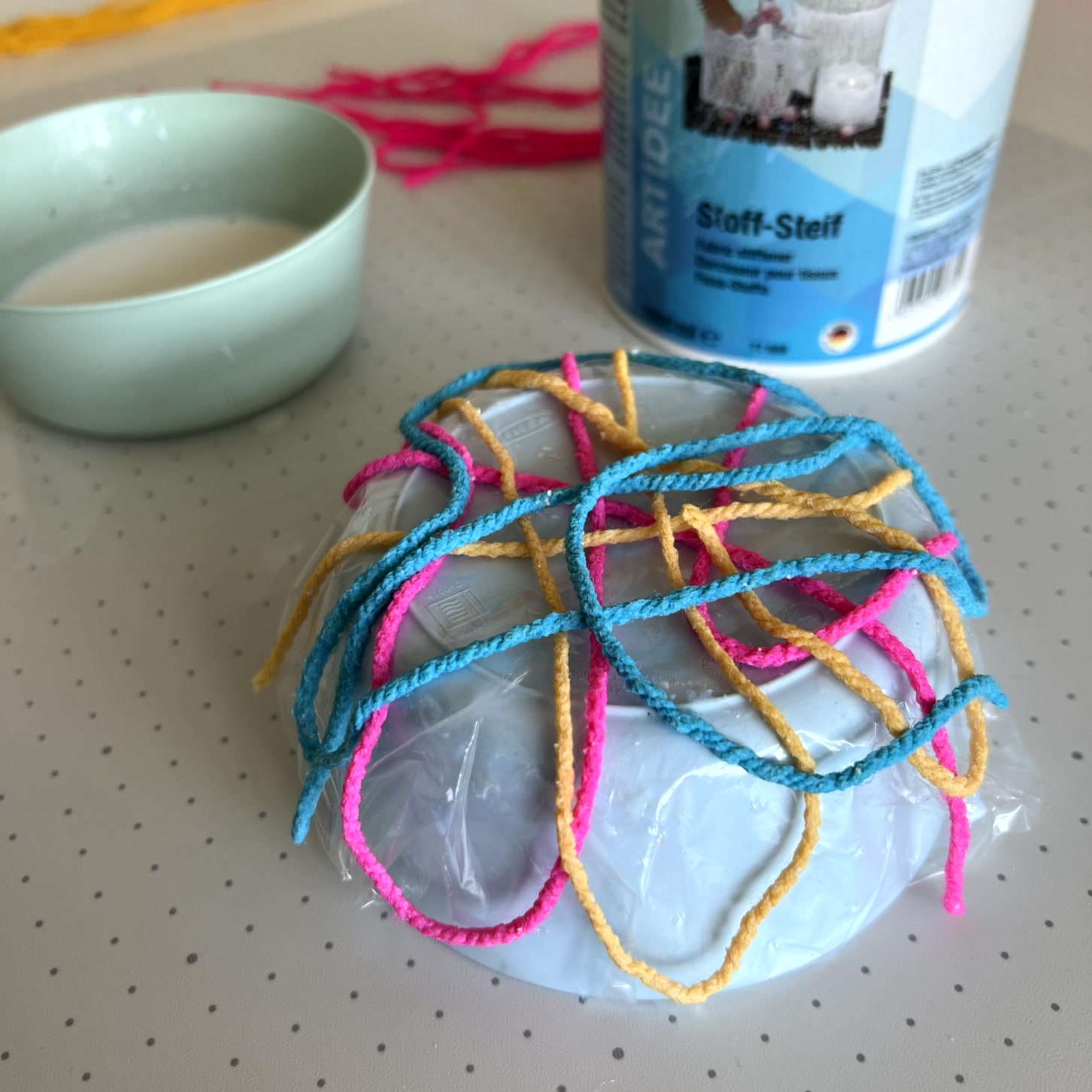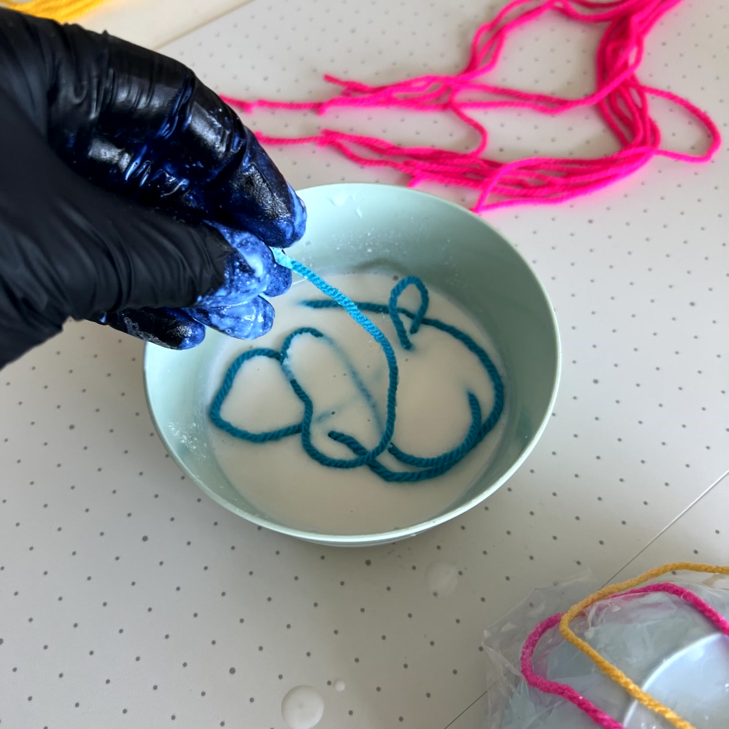 Die Garnstücke werden einzeln in das Stoff-Steif-Bad getaucht, leicht ausgedrückt und nochmals eingetaucht. So kann sich die Flüssigkeit vollständig im Garn verteilen. Wichtig: Handschuhe tragen und für gute Belüftung im Raum sorgen!