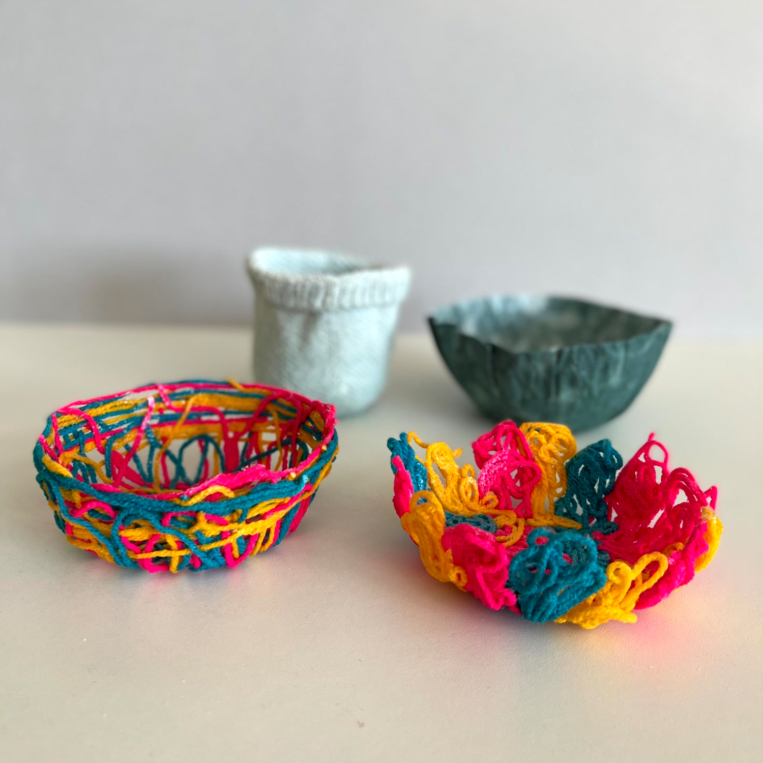 Nach einer Trocknungszeit von rund 6–8 Stunden ist das Körbchen fest geworden. Es kann vorsichtig von der Folie abgelöst werden.