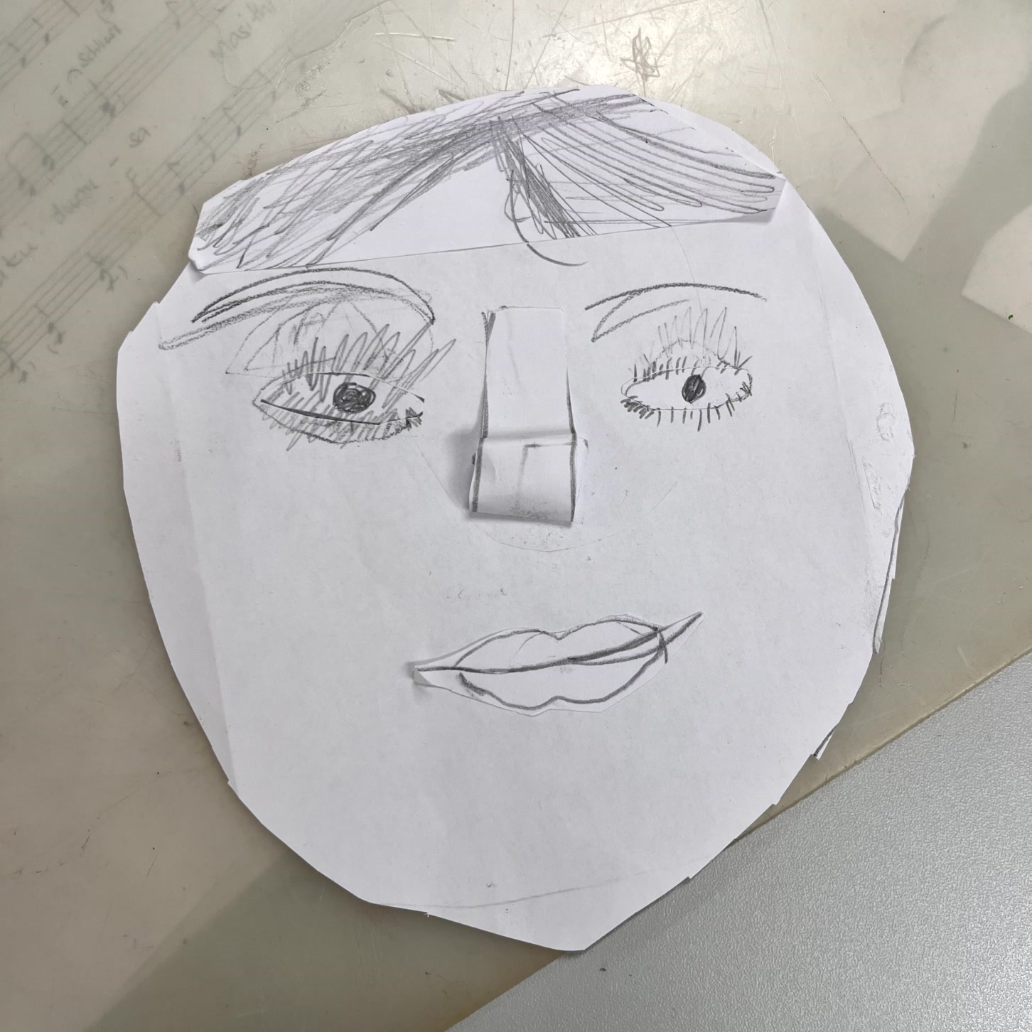 Auf der Basis der Skizze wird nun eine erste Version des Porträts aus weissem Kopierpapier erstellt. Dabei kann mit dreidimensionalen Elementen wie einer abstehenden Nase, wellenden Haaren und weiteren plastischen Elementen experimentiert werden. Verschiedene Techniken wie z. B. Falten, Schneiden und Rollen können getestet werden.