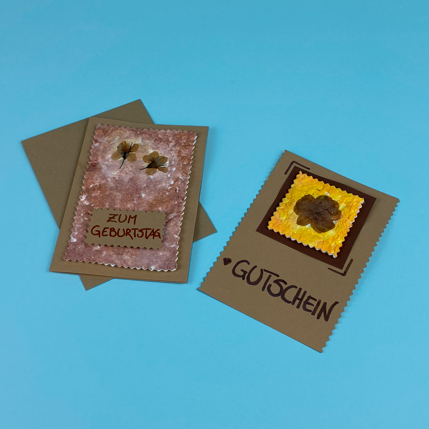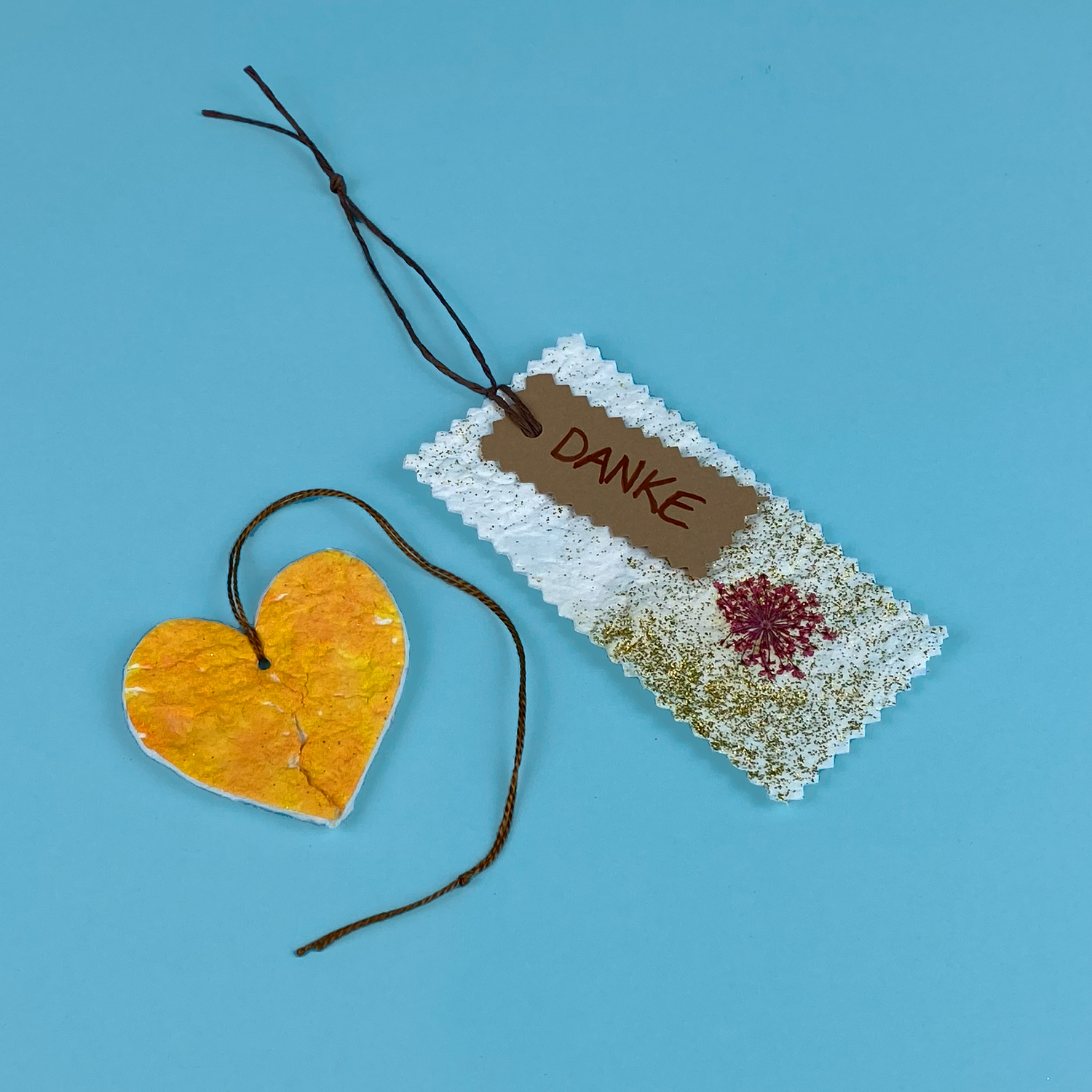 Das geschöpfte Papier kann nicht nur zum Beschreiben, sondern auch für Bastelarbeiten verwendet werden – zum Beispiel für das Gestalten von Karten, Gutscheinen, Buchzeichen, Anhängern oder auch zum individuellen Verzieren von Geschenkschachteln.