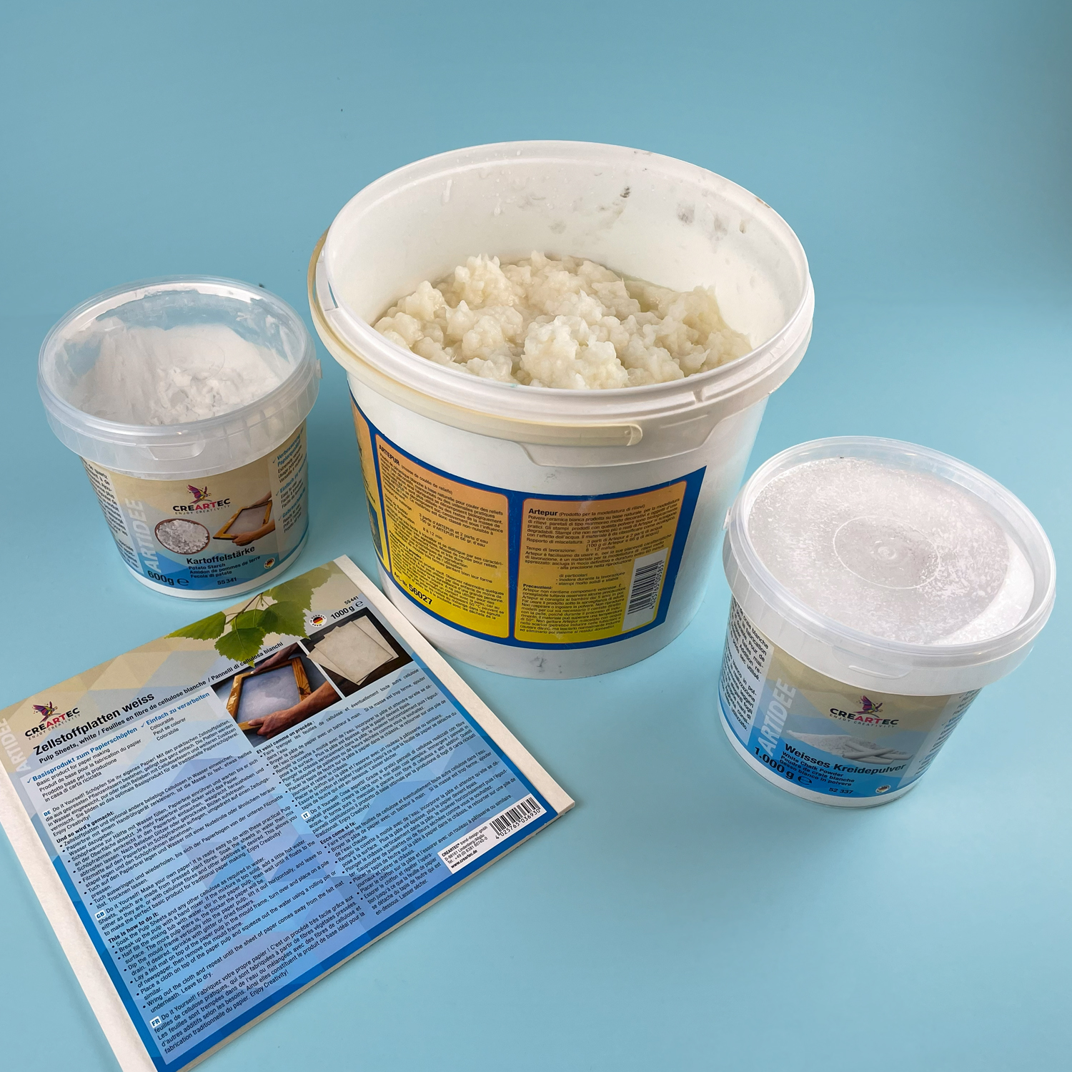 Die Pulpe wird aus Altpapier und/oder Zelluloseplatten hergestellt, indem beides in Stücke gerissen und anschliessend in warmem Wasser eingeweicht wird. Nach Bedarf werden Kartoffelstärke und Kreidepulver (für ein weisseres Ergebnis) beigemischt. Die Mischung wird püriert.