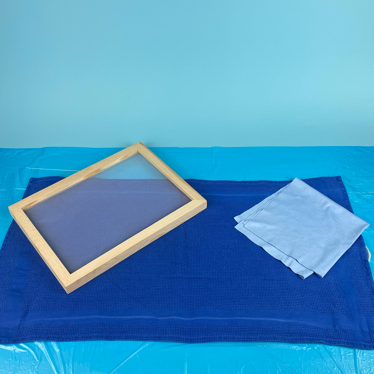 Bevor mit dem Papierschöpfen begonnen wird, werden die Arbeitsflächen «wasserfest» eingekleidet und Handtücher bereitgelegt.