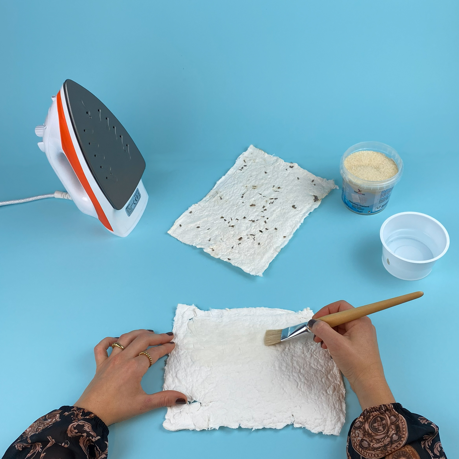 Ist das Papier trocken, wird es gebügelt (Backpapier darüberlegen) und nach Wunsch mit einer Gelatine-Mischung überpinselt.
