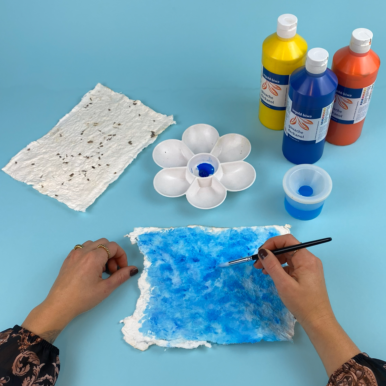 Nach dem Trocknen der Gelatine Mischung kann das Papier nach Herzenslust bemalt und weiterverarbeitet werden.