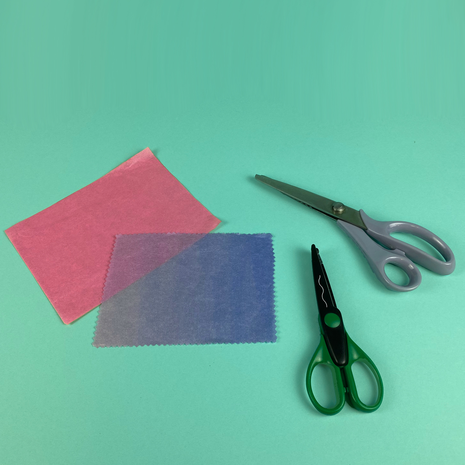 Seidenpapier in verschiedenen Farben wird rechteckig zugeschnitten. Pro Schmetterling werden zwei Rechtecke benötigt: 18 x 14 cm und 16 x 12 cm. Das kleinere Rechteck kann mit einer Zacken- oder Konturenschere zugeschnitten werden.