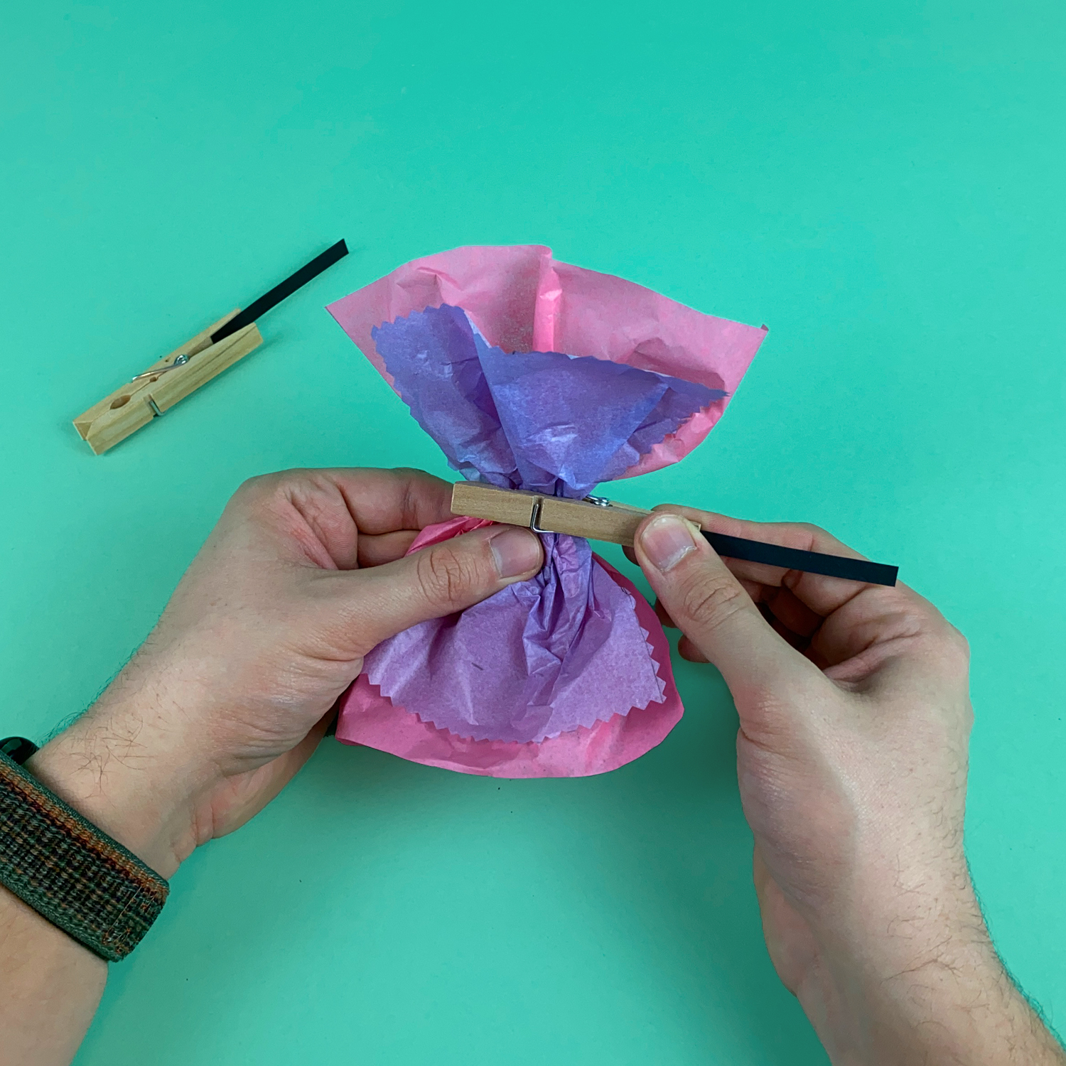 Aus schwarzem Tonzeichenpapier wird ein Streifen zugeschnitten: 0,7 x 6,5 cm. Dieser wird in die Wäscheklammer geklebt. Die Seidenpapiere werden mittig aufeinandergelegt und leicht zusammengerafft. Die Wäscheklammer wird in der Mitte eingesteckt.