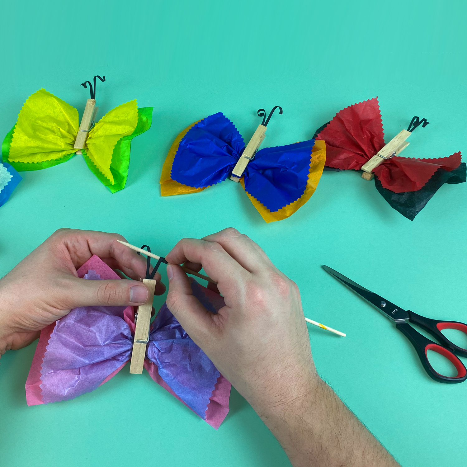 Die Schmetterlingsflügel werden zurechtgezupft. Der Papierstreifen wird in der Mitte eingeschnitten und mit einem Schaschlikstab werden die Fühler leicht eingedreht.
