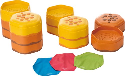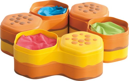 Mit den Honey Hills erstellen Sie für Ihre Kinder einen individuellen Sensorikpfad, der einlädt, verschiedene Oberflächenstrukturen und Texturen zu erforschen. Das neugierige Erkunden reichert den Schatz an Sinneserfahrungen an und fördert spielerisch das Verstehen der Eigenschaften der physischen Welt, trainiert den Gleichgewichtssinn und ermöglicht facettenreiche Lernprozesse. Die 6 Elemente können aufeinandergestapelt werden, um einen spannenden Pfad mit Höhen und Tiefen zu kreieren. Gefüllt werden sie zum Beispiel mit Gras, Sand oder Wasser. Auch die 3 bunten Säckchen können mit verschiedenen Materialien zum Riechen und Ertasten gefüllt und in die Elemente gelegt werden. Die Honey Hills werden aus thermoplastischem Kunststoff und Stoff hergestellt und eignen sich für Kinder ab 2 Jahren.