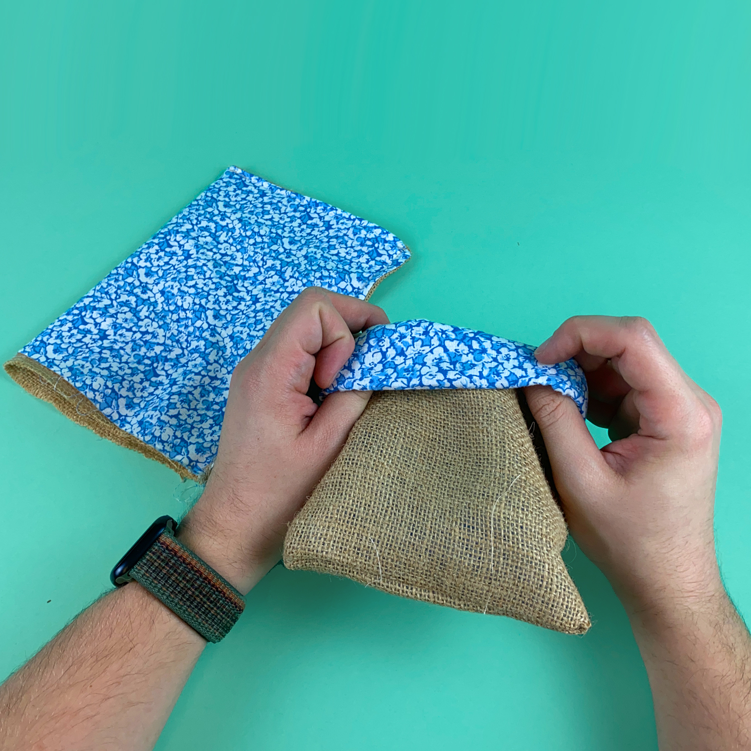 Die beiden Stücke werden zusammengenäht. Die zwei Seiten werden geschlossen, damit ein Sack entsteht. Der Sack wird umgedreht und bis auf eine Höhe von ca. 14 cm umgekrempelt.
