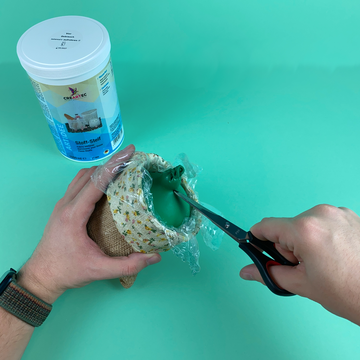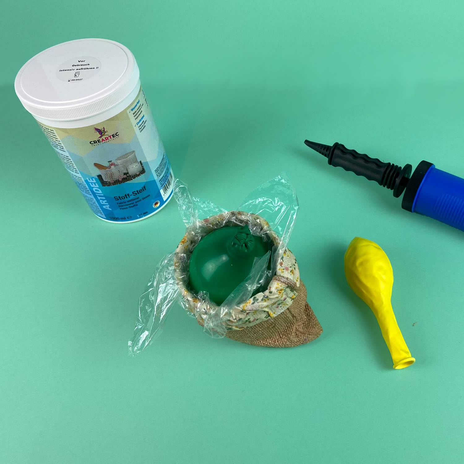 Der Sack wird mit Stoff-Steif (gemäss Anleitung) behandelt und in Form gelegt. Sobald der Sack trocken ist, kann der Ballon entfernt werden.