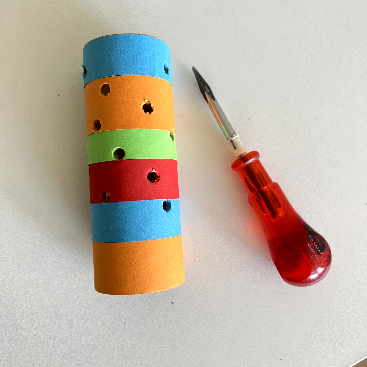 Nun werden mit einer Ahle rund 16 Löcher in die Rolle gemacht. Die Löcher müssen so gross sein, dass ein Strohhalm gut durchpasst.