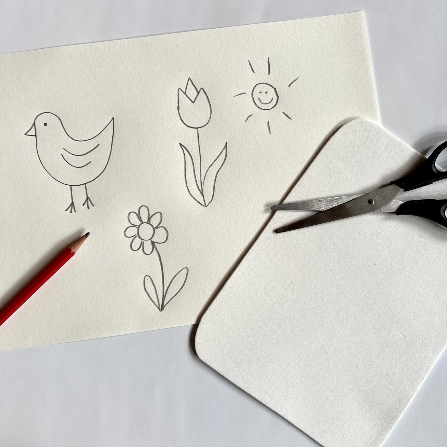 Das Moosgummi wird zur Vorbereitung auf ein A5-Format zugeschnitten. Die Schülerinnen und Schüler fertigen auf Zeichenpapier Skizzen zu verschiedenen Motiven an.