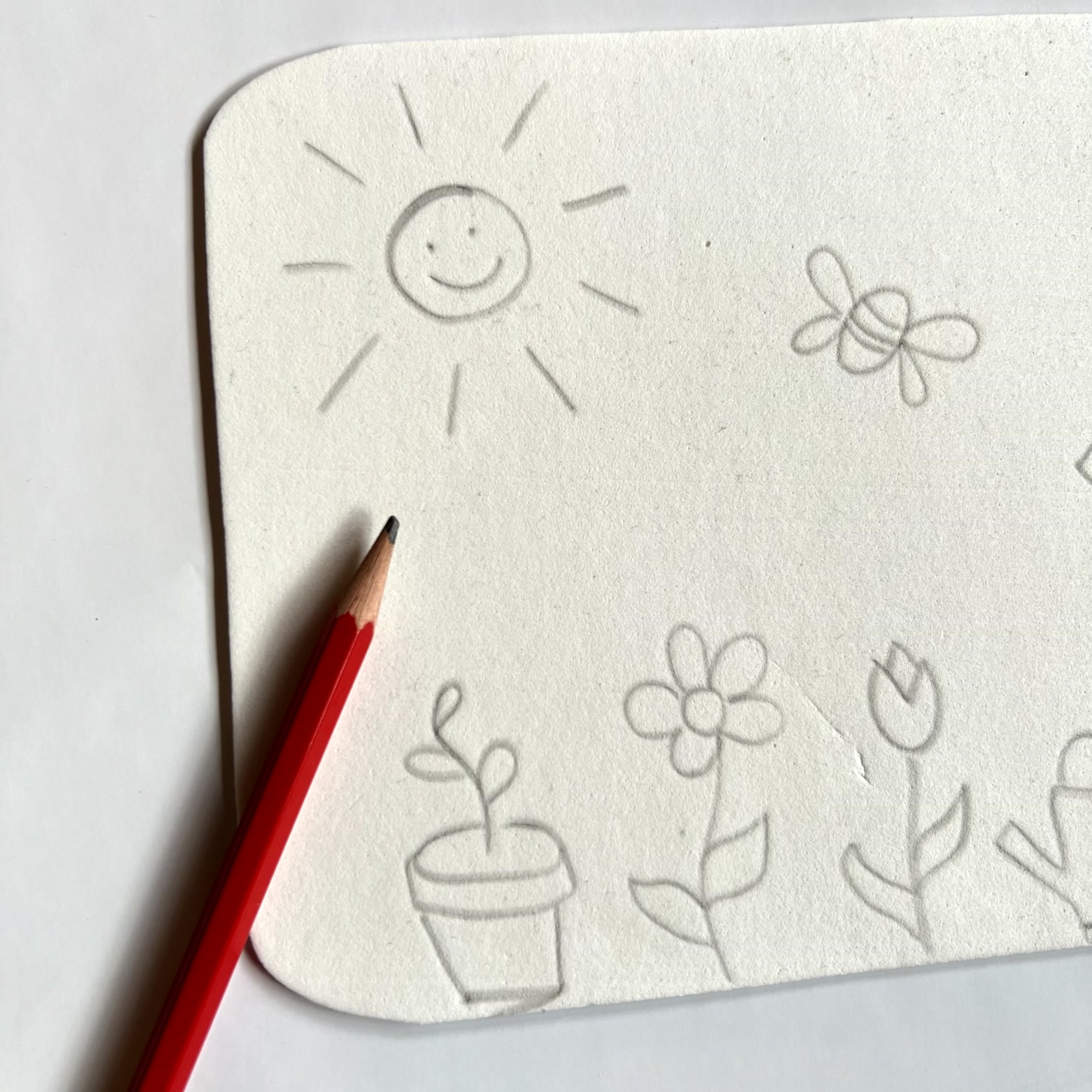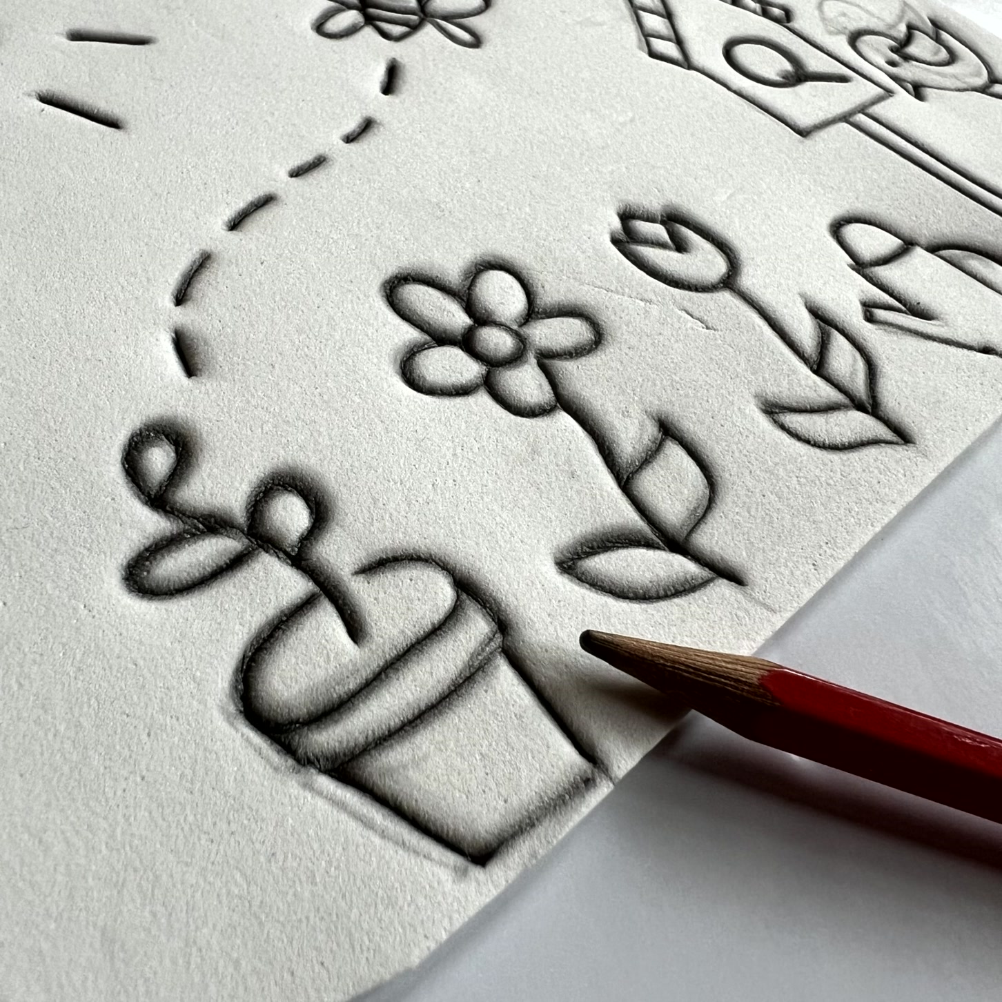 Anschliessend werden die Bleistiftlinien mit einem stumpfen Werkzeug (z. B. Bleistift, Kugelschreiber oder Stricknadel) mehrmals kräftig, aber sorgfältig nachgefahren. Die Linien sollen deutlich spürbar sein.
