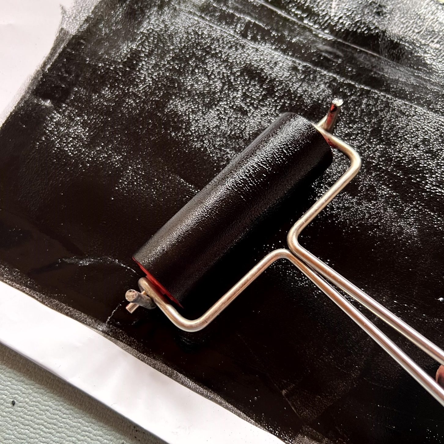 Sobald die Walze dünn und gleichmässig mit Farbe bedeckt ist, wird die Farbe ohne Druck auf das Moosgummi aufgerollt. Dabei soll die Farbe nur auf den erhabenen Flächen haften und nicht in die Vertiefungen gelangen.