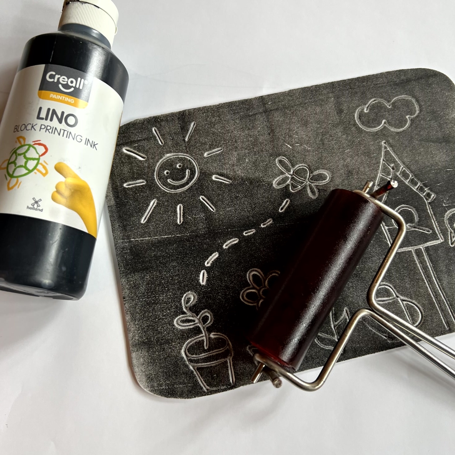 Nun wird Druckfarbe auf eine glatte Unterlage (z. B. eine Glas- oder Kunststoffplatte) gegeben und mit der Walze dünn ausgerollt.