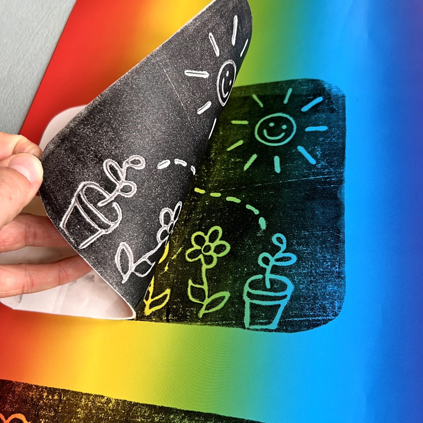 Anschliessend wird ein Zeichenpapier auf den Druckträger gelegt, mit den Händen leicht über das Papier gestrichen und danach das Papier vorsichtig abgezogen.