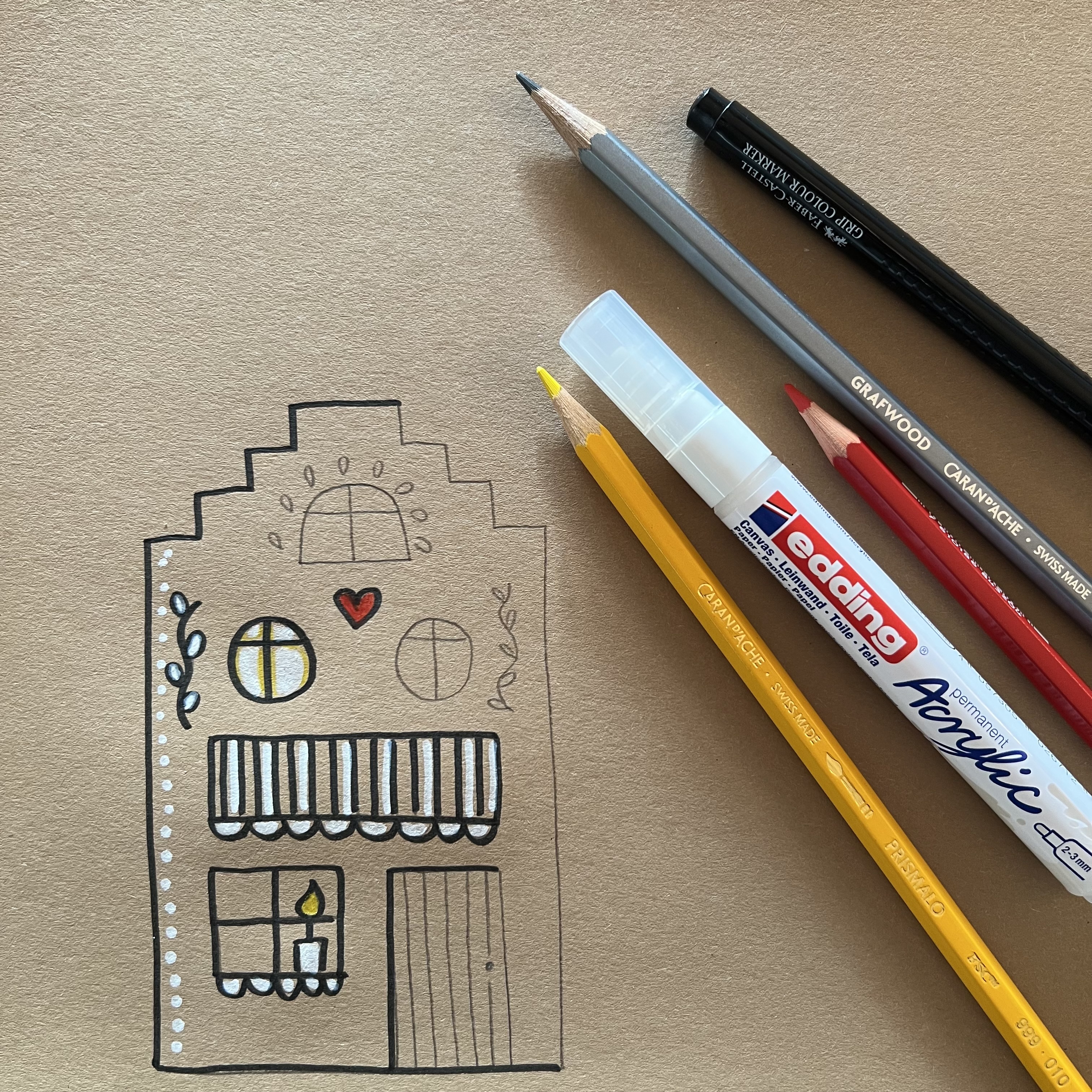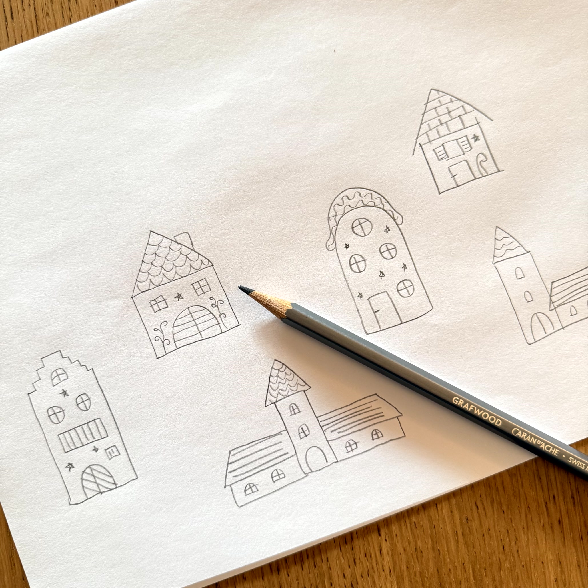 Als Einstieg werden gemeinsam Ideen für verschiedene Häuser gesammelt und erste Skizzen angefertigt. Dabei lassen sich geometrische Formen spielerisch wiederholen und festigen. Jedes Kind entwickelt eine Skizze weiter und wählt ein Haus zur Umsetzung aus.