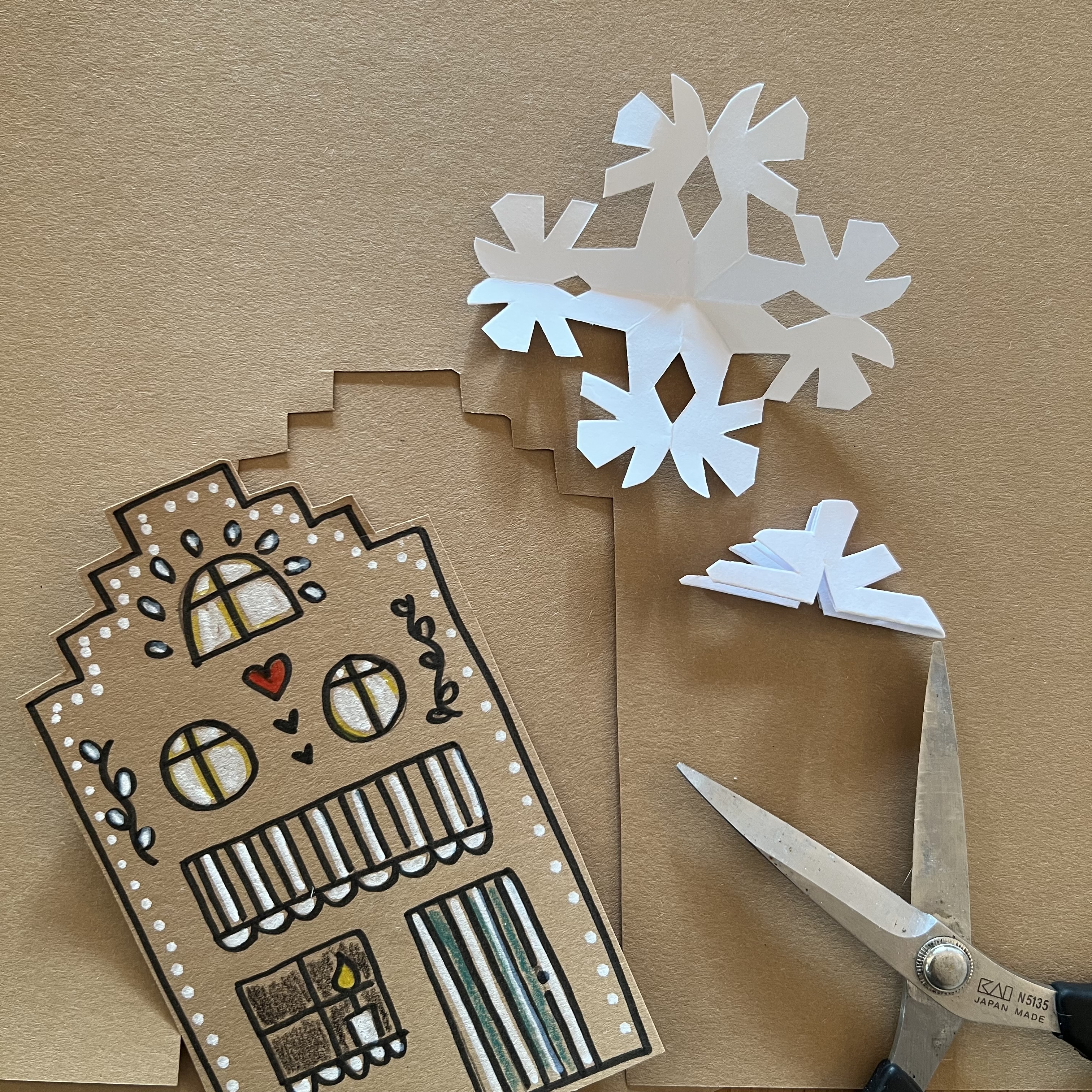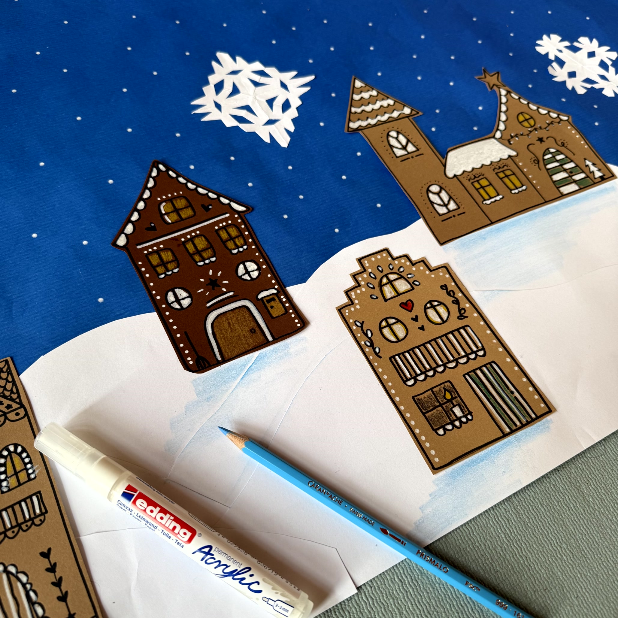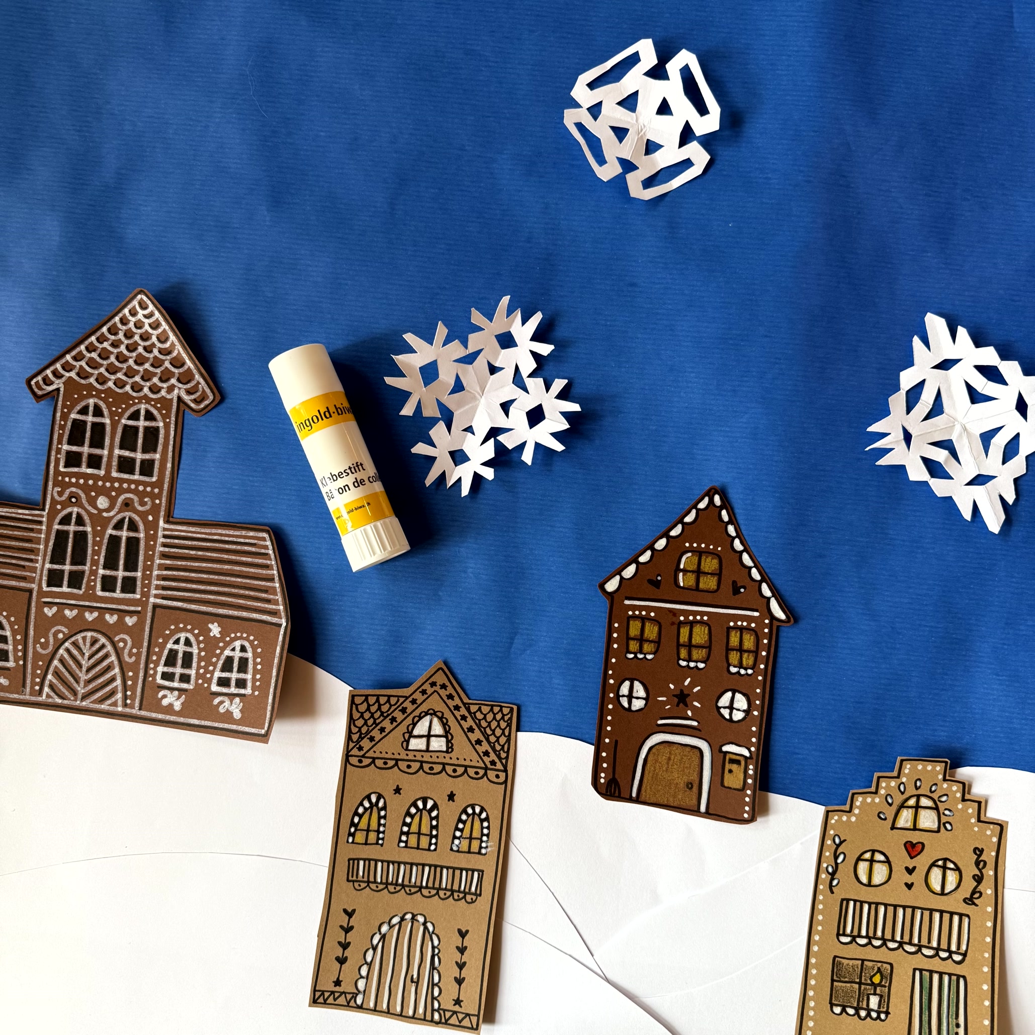 Die gestalteten Häuser werden sorgfältig ausgeschnitten. Zusätzlich entstehen aus weissem Papier feine Scherenschnitt-Schneeflocken, die später den Himmel schmücken.