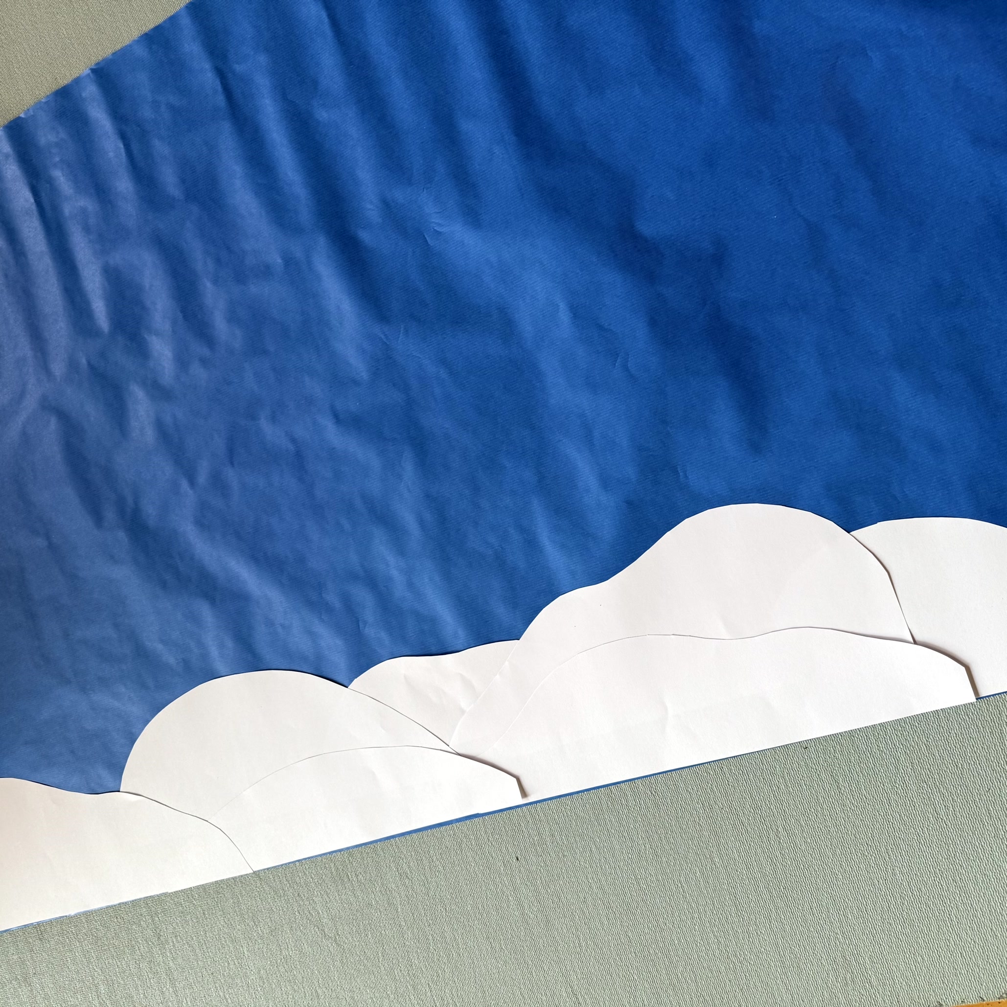 Nun wird eine lange Bahn an blauem Kraftpackpapier im Zimmer ausgelegt. Aus weissem Zeichenpapier wird eine Schneelandschaft aufgeklebt. Alternativ kann die Schneelandschaft auch mit Gouachefarbe und Pinsel aufgemalt werden.