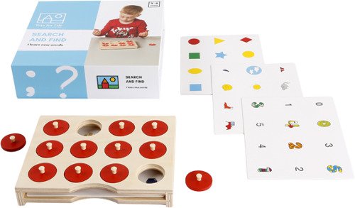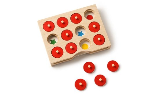 Jeu dans lequel les enfants doivent insérer une plaque de tâche dans le support de jeu en bois, puis soulever un des couvercles et décrire ce qu’ils voient. Qui trouvera le même motif sous un autre couvercle ? Renforce la coordination œil-main et la représentation spatiale.