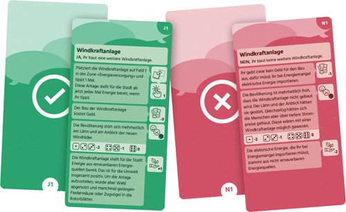 Emballage contenant toutes les cartes « conséquences » (Ergebniskarten) en allemand. Matériel complémentaire pour « Eneventura - Jeu de simulation sur les énergies renouvelables ».