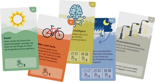 Emballage contenant toutes les cartes « événement' et 'discussion » (Spiel- und Diskussionskarten) en allemand. Matériel complémentaire pour « Eneventura - Jeu de simulation sur les énergies renouvelables ».