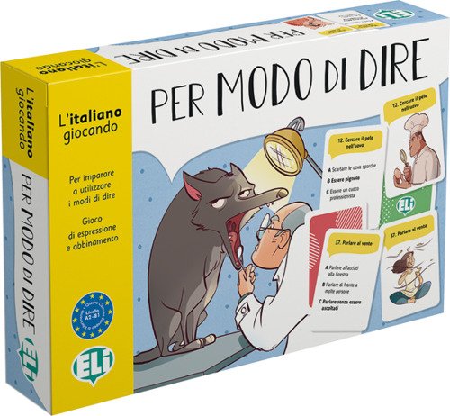 Per modo di dire è un utilissimo gioco di carte che aiuta a scoprire il significato delle espressioni idiomatiche più comuni. L’obiettivo del gioco è arricchire la conoscenza e l’uso della lingua, ma anche migliorarne la comprensione sia orale che scritta. Il gioco è composto da 132 carte divise in due mazzi: un mazzo con i modi di dire illustrati e un altro mazzo con tre opzioni di significato di ogni modo di dire, di cui solo una corretta.